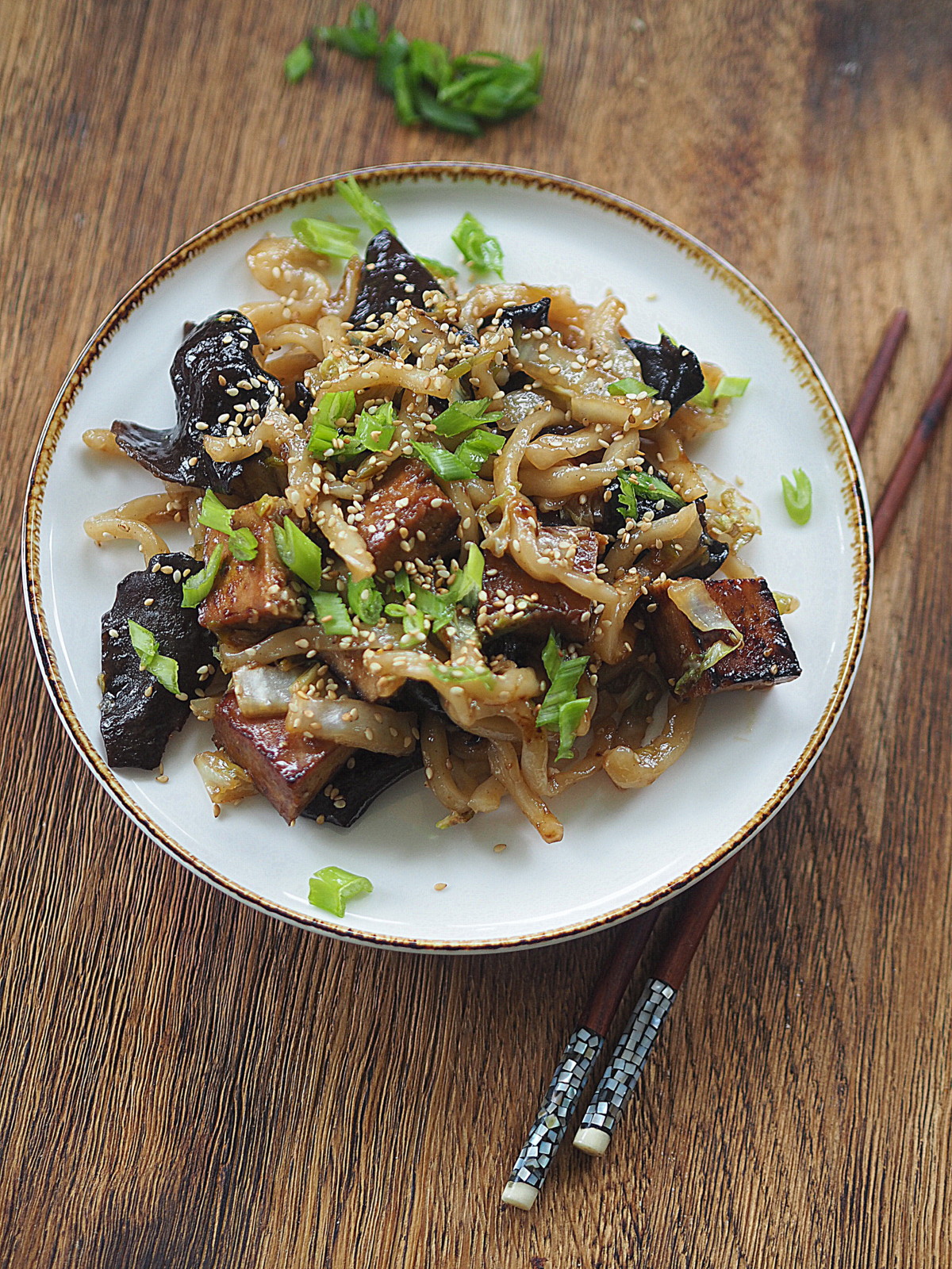 To proste danie z udonem i wędzonym tofu idealnie nadaje się na każdy dzień tygodnia. Jest łatwe i proste w przygotowaniu i bardzo sycące w smaku, z mnóstwem umami dzięki wędzonemu tofu, przypalonej kapuście i grzybom, czosnkowi i imbirowi. Zdecydowanie warto !