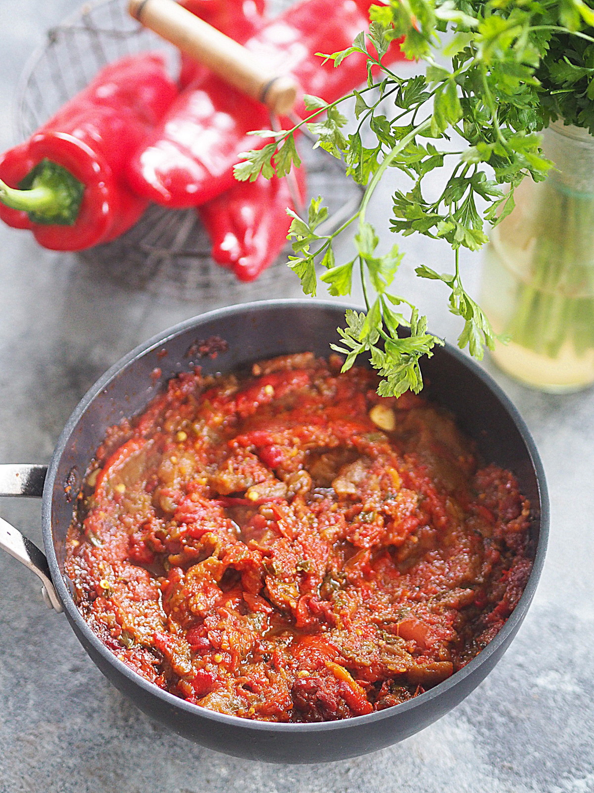 Tę samą technikę stosuje się również do przygotowywania bakłażanów i pomidorów. Po obraniu ze skórki i usunięciu pestek, wszystkie warzywa należy dusić  w mieszance oliwy, cukru, soli i octu. Gotowanie trwa dość długo, około dwóch godzin, co jest niezbędne do odparowania całej wody zawartej w warzywach. Pozostanie za to piękna i gęsta, pomarańczowoczerwona pasta, którą można przechowywać w wysterylizowanych słoikach przez całą zimę.