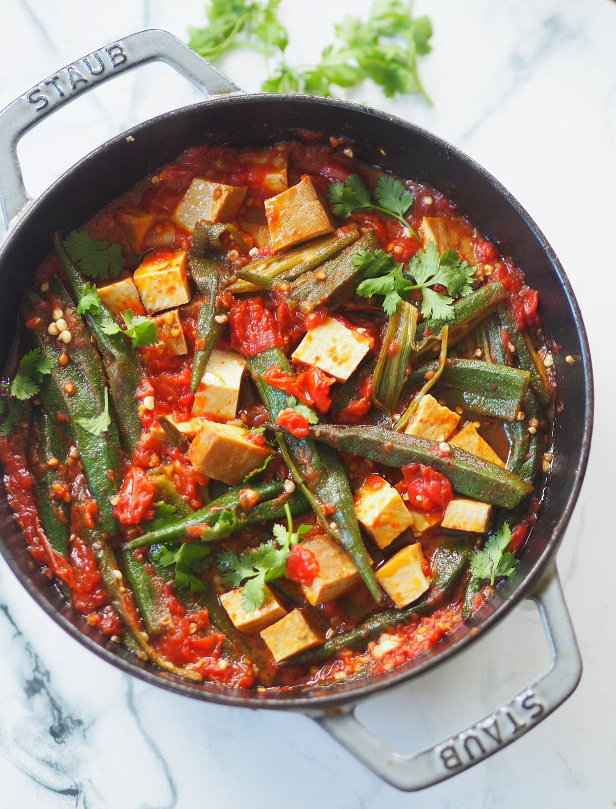 Okra w sosie pomidorowym z tofu i kolendrą