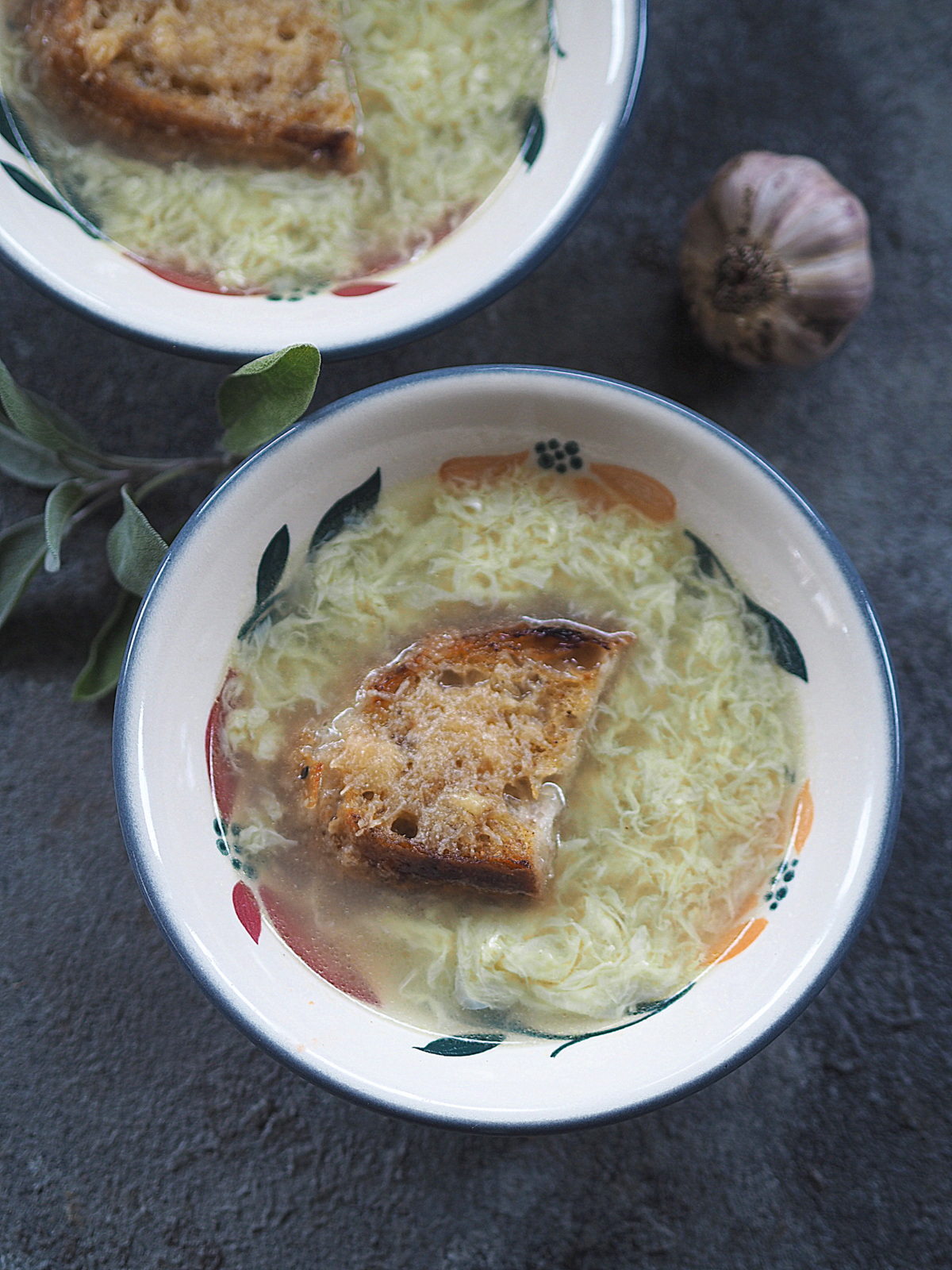 Druga metoda, którą dzisiaj przygotowałam, polega na dodaniu do bulionu roztrzepanych jajek. Niektóre przepisy zawierają całe jajka, inne tylko białka, a jeszcze inne tylko żółtka dla uzyskania bardziej kremowej zupy. Zupę podaje się z kromką grzanki z serem. Wymieszanie całych jajek lub białek z bulionem tworzy soczyste, drobne strzępki, nadając zupie bardziej treściwą konsystencję. Dodaje to również zdrową dawkę białka, a z kromką grzanki i serem na wierzchu masz pyszny, pożywny obiad.