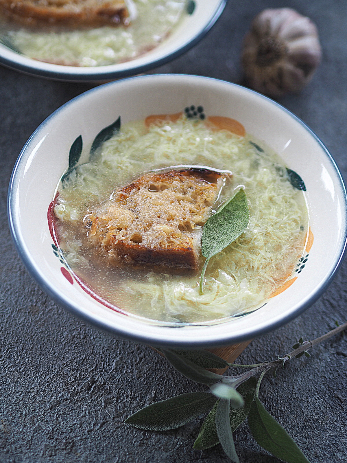 Pierwsza lekka wersja, wymaga jedynie zagotowanej wody z kilkoma ząbkami czosnku, liśćmi laurowymi i świeżą szałwią. Następnie consommé jest filtrowane i popijane bez dodatków, z odrobiną oliwy z oliwek. Delikatna mieszanka ziołowych aromatów ziół i owocowych nut oliwy z oliwek działa zarówno detoksykująco, jak i kojąco i, co jest zaskakujące, również sycąco.