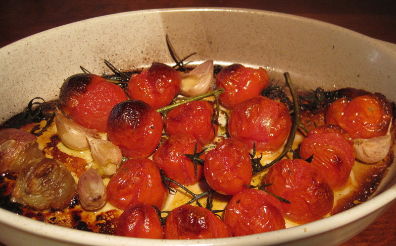 Nagrzewam piekarnik do 220 stopni. Pomidorki ,szalotkę i czosnek układam w naczyniu żaroodpornym.Polewam oliwą, dodaje rozmaryn, pieprz i sól.Zapiekam ok. 25 minut.