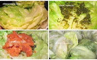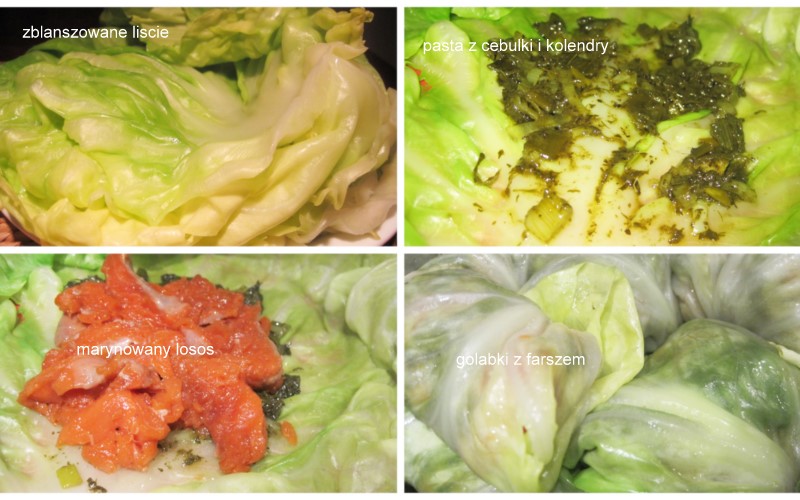 4. smarować tym liście kapusty, kłaść kawałeczki łososia i zawijać.