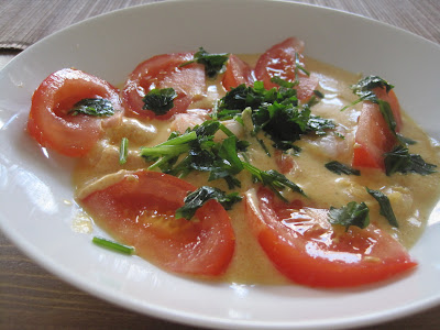 Wyłożył krewetki na talerze,dodał pomidory, posypał natką.Mniam………