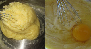 Piec nagrzać do 200 stopni.Do garnka wlać wodę,dodać masło i sól.Doprowadzić do wrzenia i zdjąć z ognia.Dodać mąkę i wymieszać.Postawić garnek na ogniu,mieszać ciągle ok.5 minut aż ciasto zrobi się gęste.Kiedy ciasto odrywa się od brzegów garnka,przełożyć ciasto do miski.Mieszać aż trochę ostygnie.Następnie wbić po kolei jajka, cały czas miksując masę.Ciasto powinno być gładkie i błyszczące.